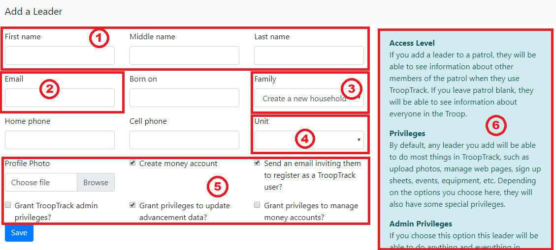 In this section, you can add a profile picture and give certain accesses and privileges. This shows the options for adding a leader. Adding a scout or other adult leader will have fewer options.
