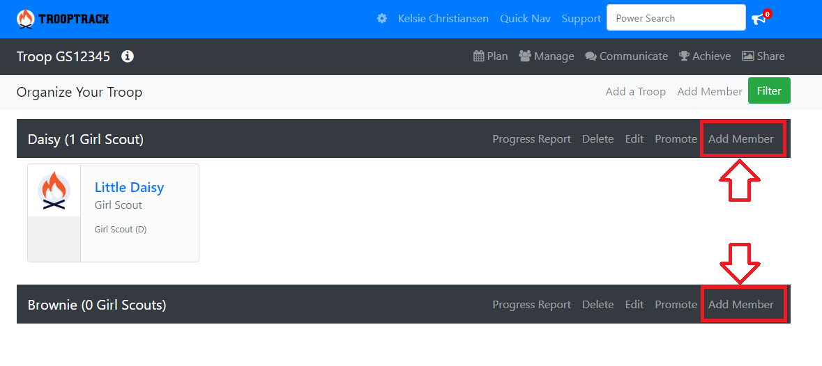 Adding a member to your troop is simple and there are a couple of ways to do so. Like most things, you can get there using one of the badge buttons. Just click on the Manage badge then Members, then select what type of member you would like to add as shown below. Options will vary by organization.