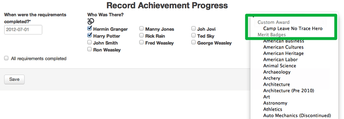 If you find yourself using the custom awards feature to create officially recognized awards that are missing from TroopTrack, please open a support ticket instead and we will add the awards ASAP.