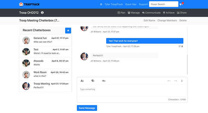 We are excited to announce the new chat feature within TroopTrack so troops can communicate more instantly and easily. Keep in mind that TroopTrack Chatterbox chat feature is still an early beta feature. TroopTrack hopes to arrive arrive at a finalized chat feature that makes TroopTrack so much more useful.