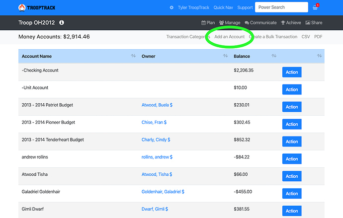 To create a troop money account, just click "Add an Account" to get started. I've circled the location of the add account link below.