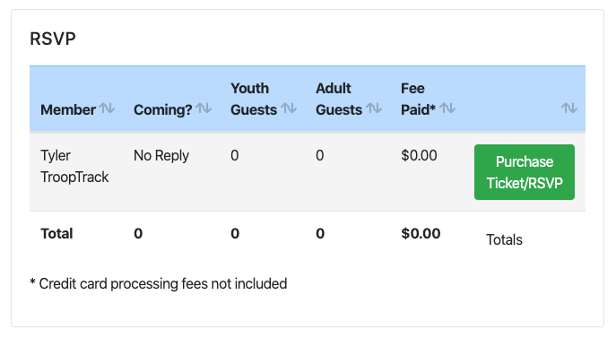 Paying for an event is easy. When you RSVP through TroopTrack for an event, you will have the opportunity to pay for the event in the event details. You will just need to click the big-green button that says 'Purchase Ticket / RSVP'.
